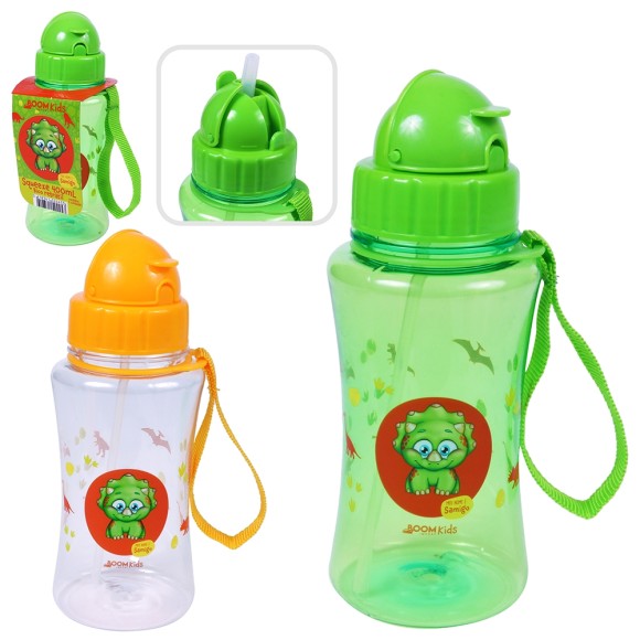 A Garrafinha Samigo - Dino Amigo, com 400ml de capacidade, possui um canudo em silicone macio e higiênico que fica guardado assim que a tampa é fechada, criando uma vedação à prova de vazamentos.