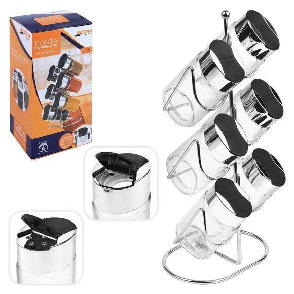 1 Porta Tempero com Suporte Aramado Cromado com 6 Potes de Vidro.